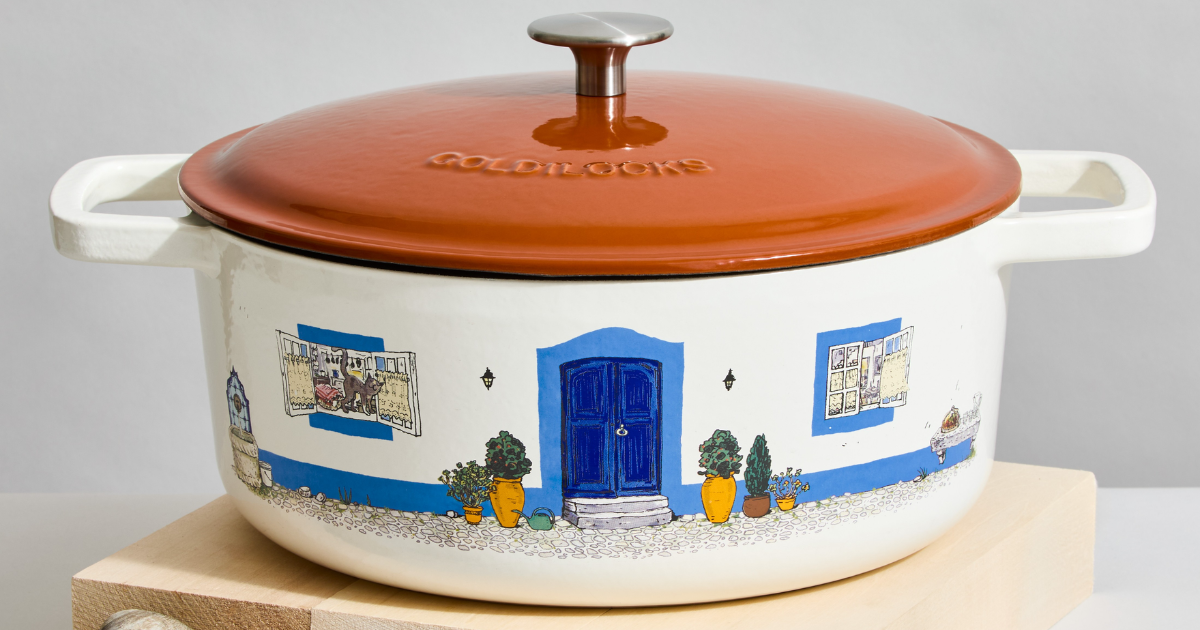 "When Minsuk Kim, a co-founder of the kitchenware line Goldilocks, discovered that artwork could be crisply applied onto the brand’s enameled cast iron Dutch oven, he and his co-founder, Jessica Sheft-Ason, launched a series of limited-edition artist collaborations, most recently with Kim’s longtime friend Joana Avillez, known for her whimsical line drawings. (For the first Dutch oven artist collaboration two years ago, the Maine-based printmaker Anastasia Inciardi designed a series of tomatoes from hand-carved linoleum stamps.) “I’ve always loved Joana’s work, so we let her do whatever she wanted,” says Kim. Avillez came up with a Dutch oven inspired by Portugal’s blue-trimmed Alentejo bungalows and her parents: Her mom collects miniature house figurines; her dad, the family chef, was from Portugal. “The idea that something hot is inside the pot, which is also the house, is so intoxicating to me,” says Avillez. “If you push the lid to the side and let the steam out, it’s like a chimney.” Avillez’s pen-on-paper tableau — scanned, printed, applied by hand and fired onto the surface of the pot — extends to the back."
