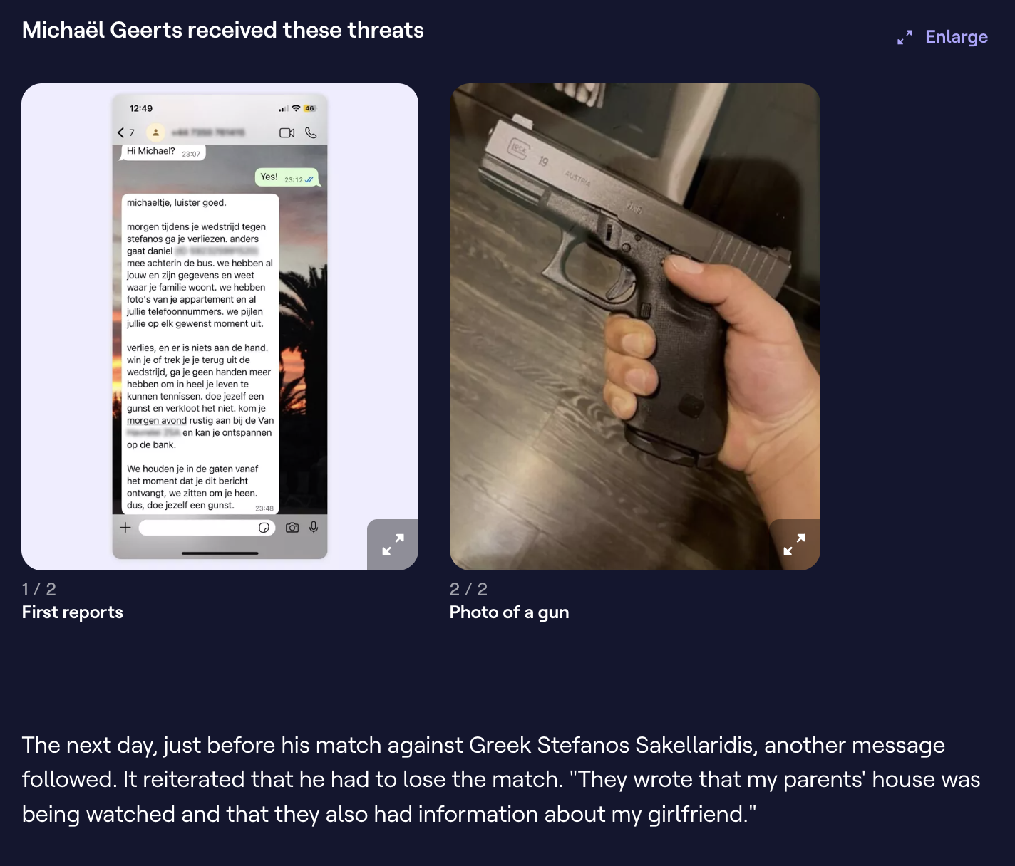 - A Belgian ATP player, Michael Geerts, received similar messages and threats while playing a Challenger in Greece. (VRT.be, h/t Reddit)