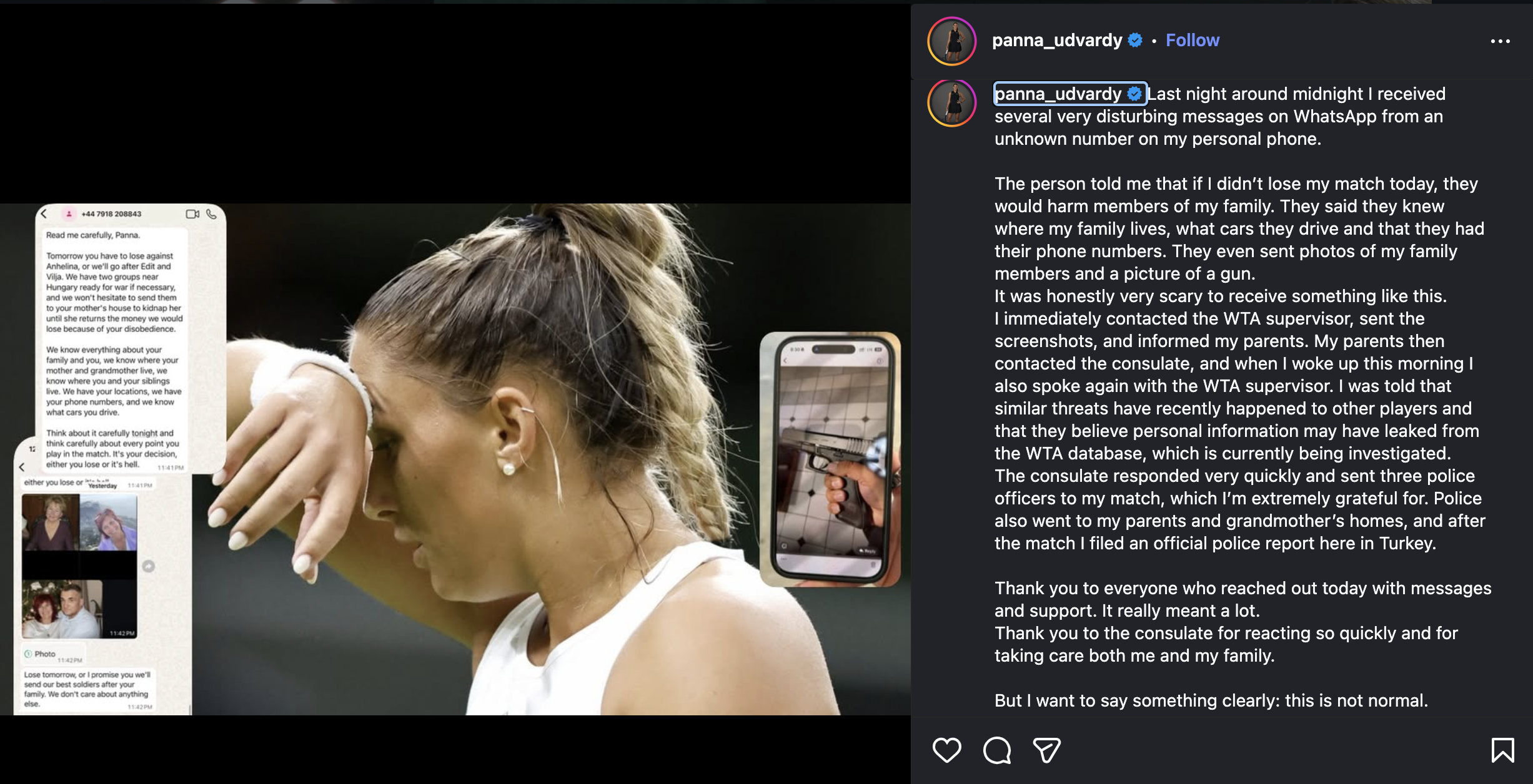 - Did the WTA get breached? A few days after Lucrezia Stefanini posted about getting a photo of a gun sent to her and her family threatened ahead of her first-round qualifying match in Indian Wells, Panna Udvardy posts about a similar incident ahead of her participation at an ITF event in Antalya, Turkey. According to Panna's post, she spoke to the WTA supervisor who told her "they believe personal information may have leaked from the WTA database." That would certainly explain how bettors suddenly have players' private phone numbers – usually these messages are sent on social media accounts – and home addresses. Needless to say, this is beyond alarming if true. The WTA has yet to confirm whether a breach occurred. (Instagram)