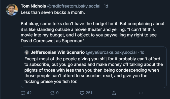 Everything Twitphiles cite as defects on Bluesky are, for me, the feature. And nothing was more illustrative of that fact than me going viral over the weekend for a completely normie and earnest tweet about public libraries, which was actually just a subtweet about the dumb fist-shaking at news paywalls going on in the mentions of a political commentator's tweet, who wrote an op-ed on the new stupid war some orange Kool-Aid man decided to cannonball into.