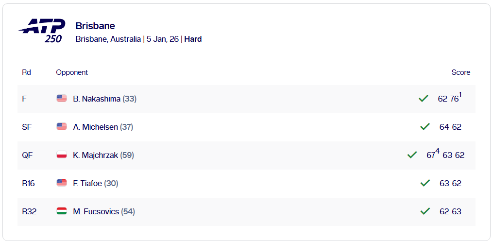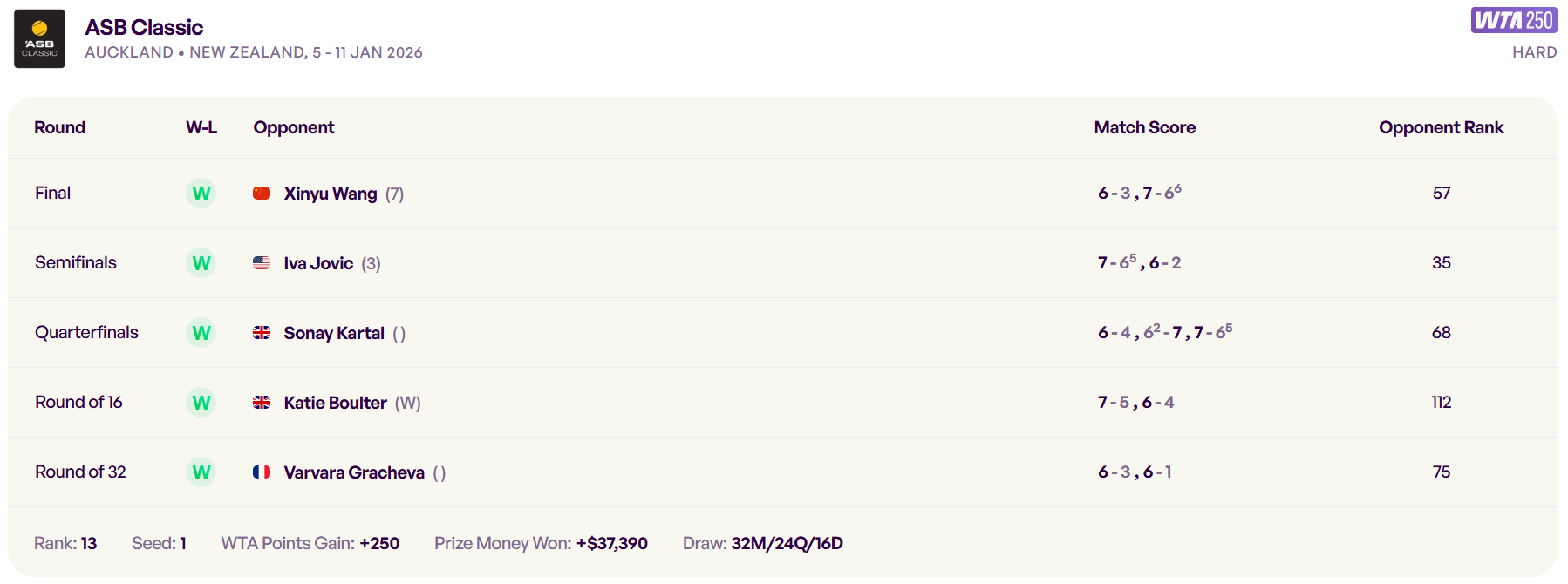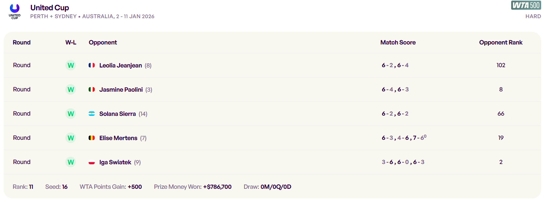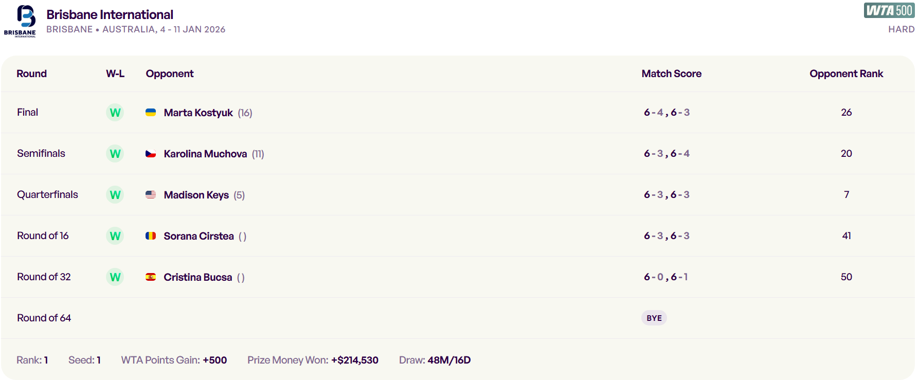 Speaking of Kostyuk: She had just one Top 10 win last year. She scored three in a row in Brisbane, beating Amanda Anisimova, Mirra Andreeva, and Jessica Pegula. That will make you sit up and take notice.