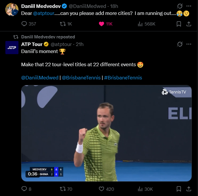 Cool stat: Medvedev is the third active player to win 20 tour-level hard-court trophies, joining Novak Djokovic (72) and Jannik Sinner (21). Thanks ATP!