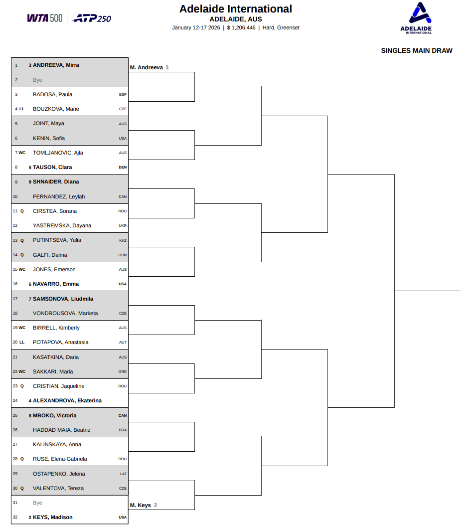 Top seeds: Madison Keys, Mirra Andreeva, Ekaterina Alexandrova, Emma Navarro (Top seed Jessica Pegula withdrew after the draw, Andreeva took her spot at the top of the draw; Kostyuk also withdrew, both citing change of schedule)