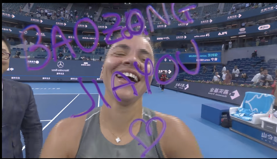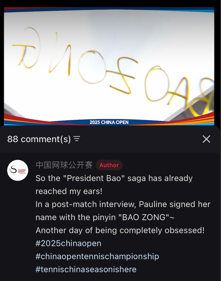 Coco Gauff is the "Queen of Fruit" in China. Pegula has learned her nickname "大富"(Big Rich)here. (By the way Emma Navarro is the Second Rich as "二富"). Now Paolini signed her nickname "Bao Zong"(Boss Pao)on the camera.